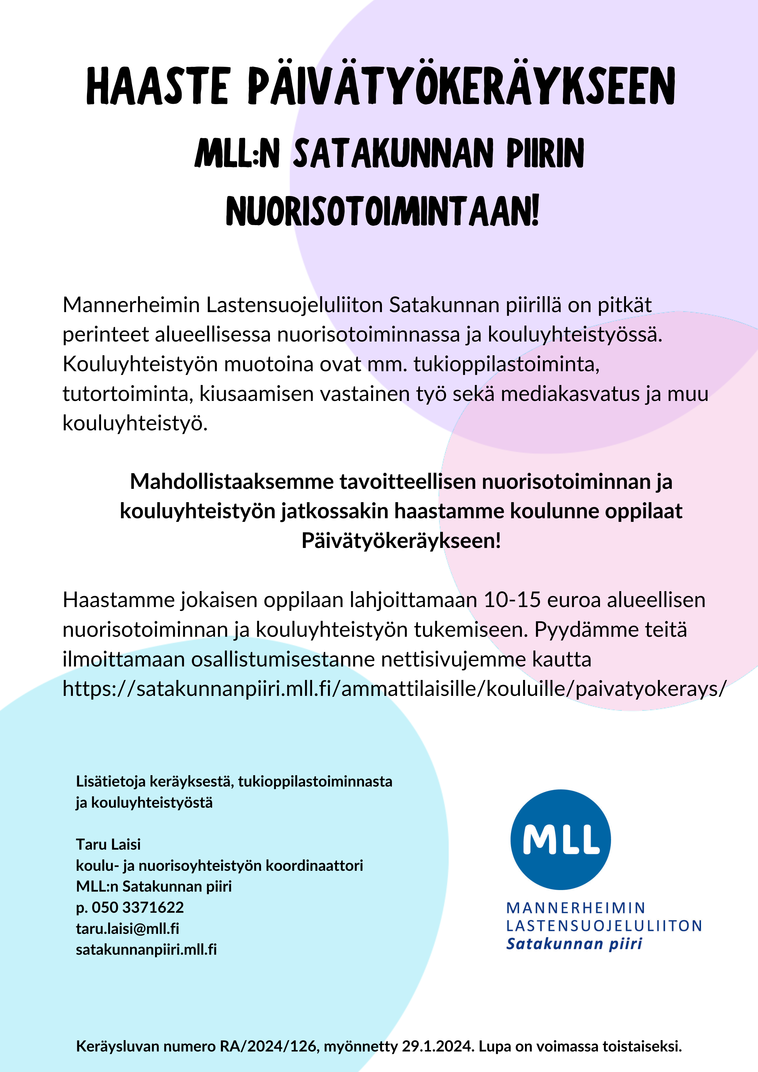 Mahdollistaaksemme tavoitteellisen nuorisotoiminnan ja kouluyhteistyön jatkossakin haastamme koulunne oppilaat Päivätyökeräykseen.