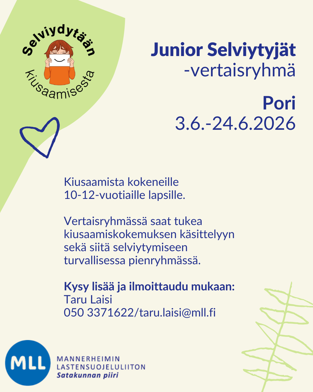 Suljettu pienryhmä kiusaamista kokeneille 4. -6. luokkalaisille kokoontuu viisi kertaa MLL Satakunnan piirin tiloissa Antinkatu 8.